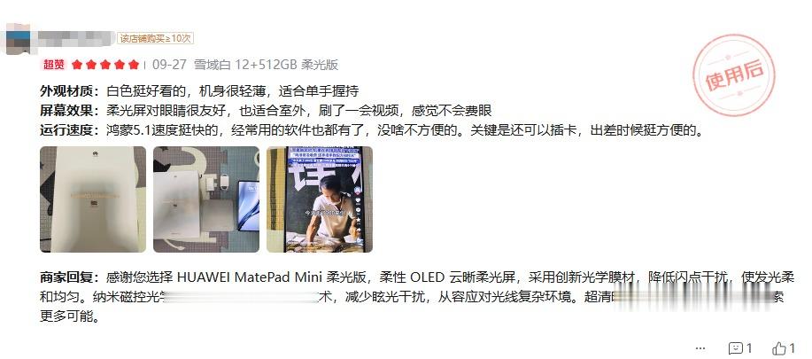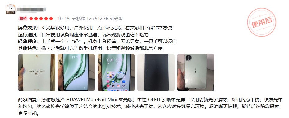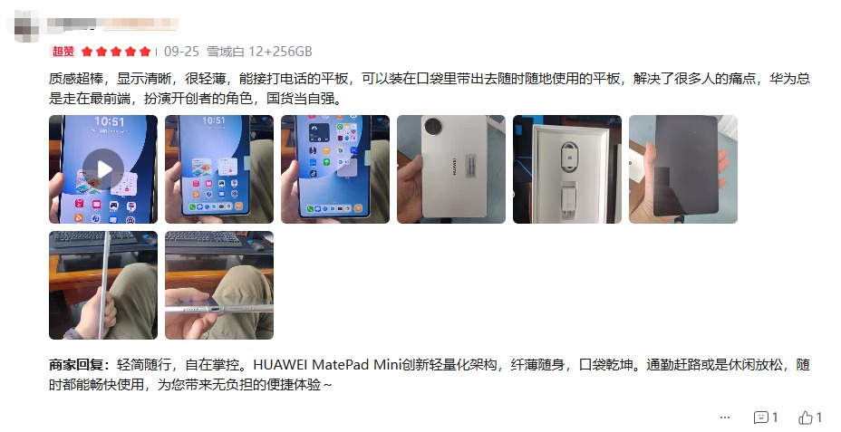 外观与便携性上,“机身超轻薄”“单手轻松握持” 是用户评价中的高频表述。大量用户表示,华为MatePad Mini比许多主流直板手机还要轻薄,持握手感超棒。