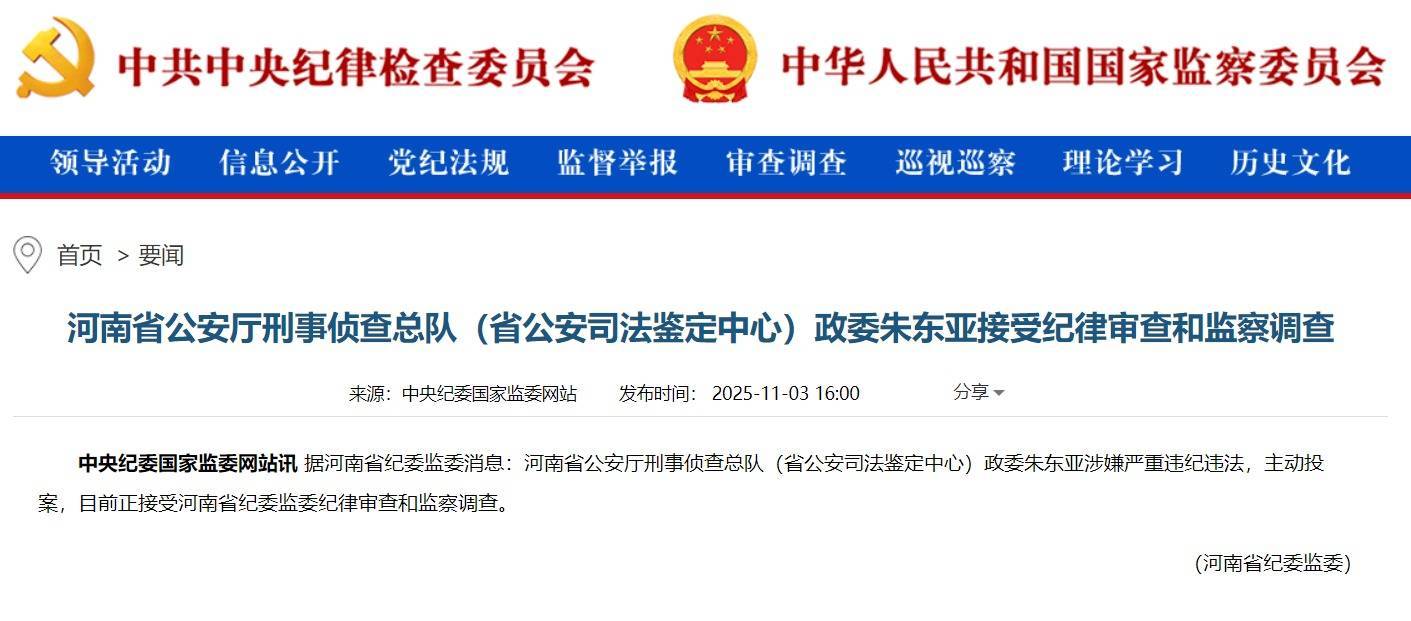 据河南省纪委监委消息:河南省公安厅刑事侦查总队(省公安司法鉴定中心)政委朱东亚涉嫌严重违纪违法创达盈,主动投案,目前正接受河南省纪委监委纪律审查和监察调查。